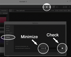 Kontakt画面上の歯車のアイコンをクリックするとOptionのメニューが表示されます。次にMemoryのタブをクリックするとプリロードの設定画面が表示されます。画面左下付近のチェックボックスにチェックを入れ、白く塗りつぶされた状態(Kontakt5.6)、またはチェックマークが入った状態(Kontakt4.1~5.5)にしてください。さらに’OverrideInstruments preload size’の値を最小の6.00kBにしてください。もしストリーミングが追いつかず、音切れなどが発生する場合は必要に応じてその値を増やしてください。